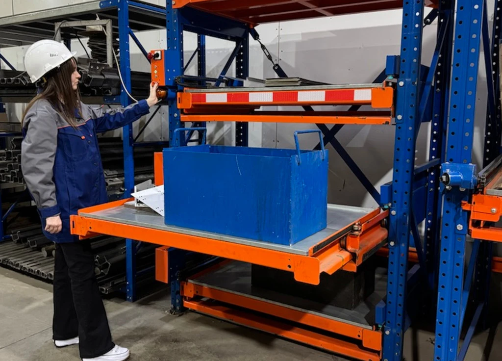 Стеллаж с полками полного выдвижения для хранения тяжёлых металлических ящиков, контейнеров с литьём и поковками. Механизм защиты от одновременного выдвижения нескольких платформ для безопасности. Электропривод полок для цехов с высокими требованиями к эргономике и скорости доступа к грузам.