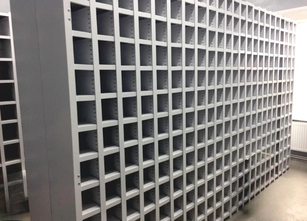 Полочный стеллаж оснащённый съёмными разделителями, обеспечивает надёжную фиксацию папок — они не опрокидываются и не смещаются в ячейках. Такое решение представляет собой более экономичную альтернативу традиционным ячеистым шкафам.